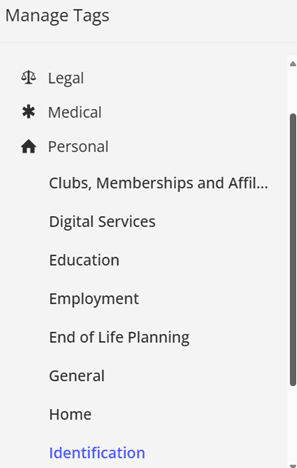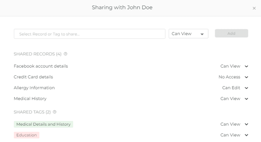 - No Access (Record Only): Your Trusted Party is explicitly prevented from viewing this record, even if its associated tag has been shared. This does not prevent the record from being included in your Legacy.