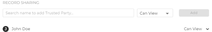 Navigate to the Sharing tab where you can search and select Trusted Parties, plus view a list of any Trusted Parties who currently have access to the record: