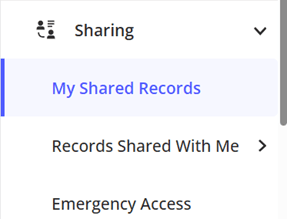 The Sharing section provides an overview of records shared with you and those you have shared with Trusted Parties. It displays a comprehensive list of all shared records between you and your Trusted Parties: