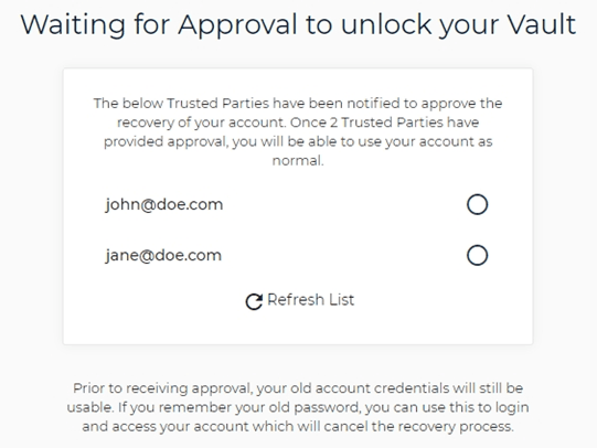 If you opt to use your Trusted Parties to recover your account, you will first need to verify you still have access to the email associated with your account. Once verified, the recovery process will begin and you will be prompted to create a new password.